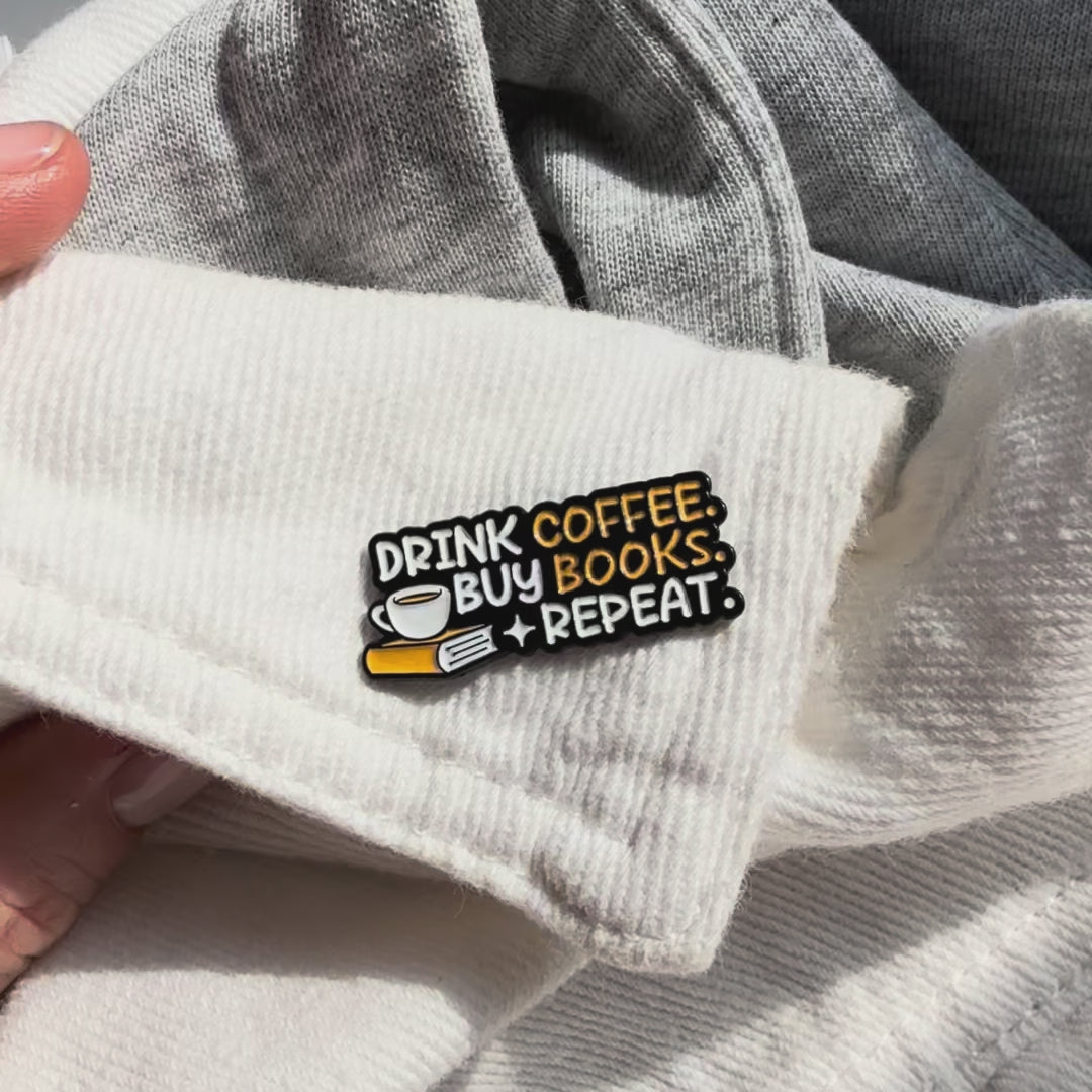 Celebrate your perfect routine with our Drink Coffee, Buy Books, Repeat enamel pin. Designed for book lovers and coffee enthusiasts, this charming accessory is ideal for tote bags, denim jackets, backpacks, or pin boards.