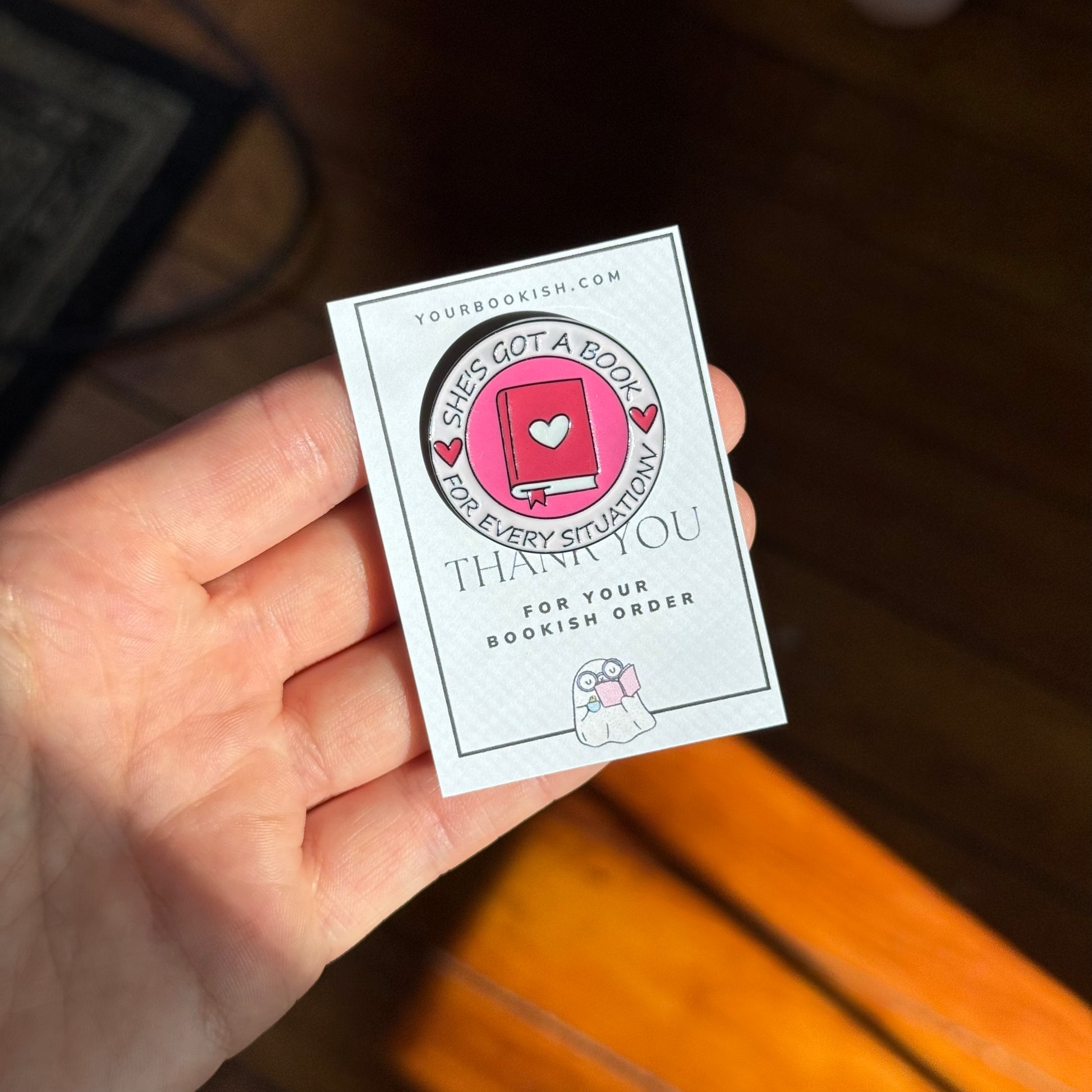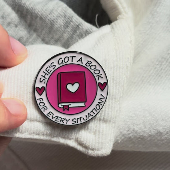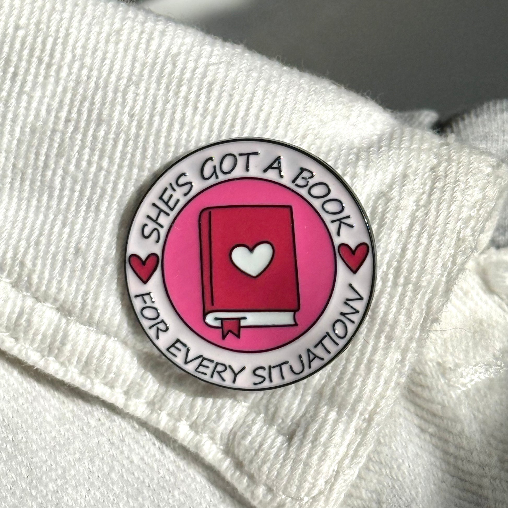 For the reader who always has the perfect book in hand, our She’s Got a Book for Every Situation enamel pin is a must-have accessory. Designed for book lovers who carry stories everywhere, this charming pin adds a bookish touch to tote bags, jackets, backpacks, and pin boards.